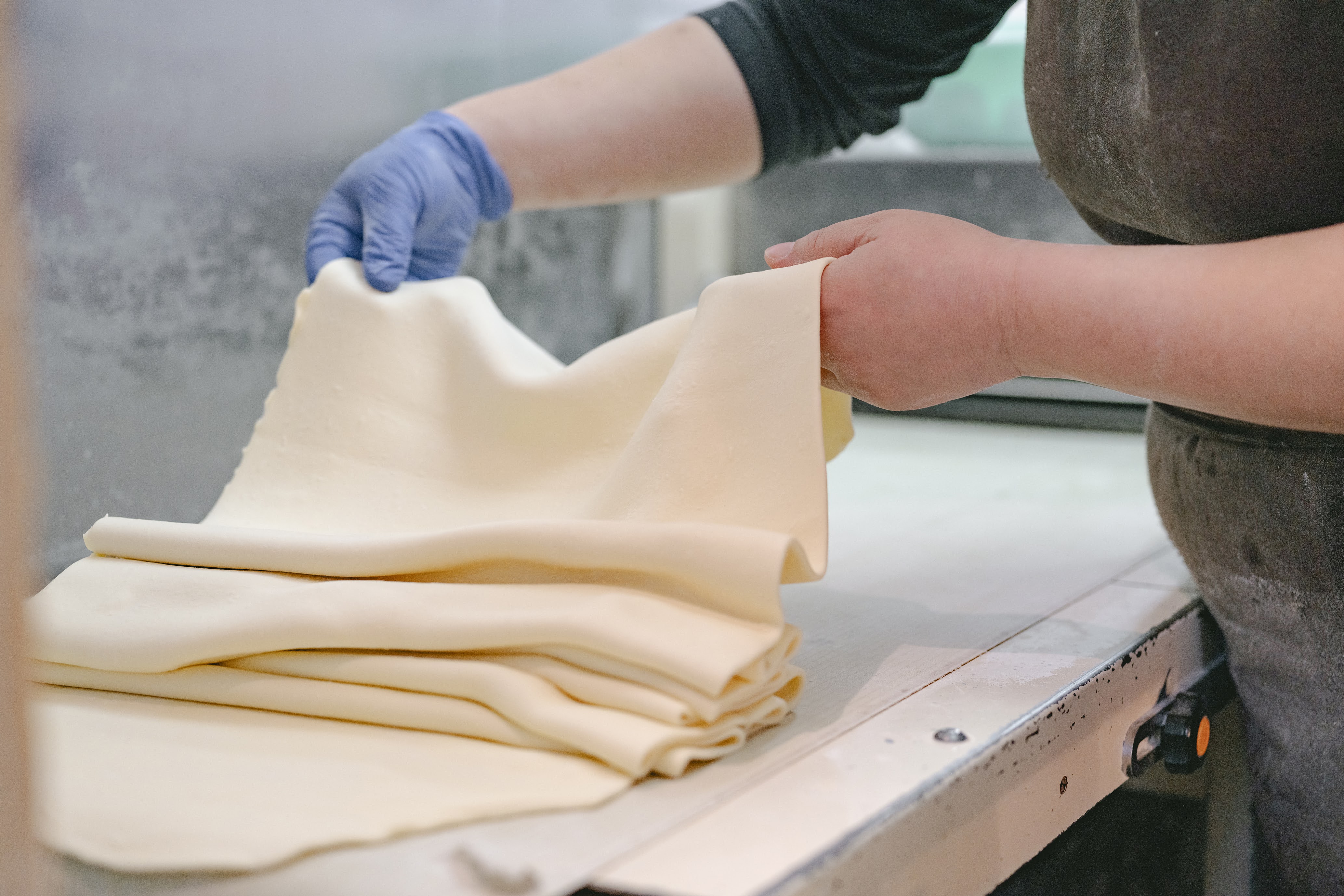 頬張った時の優しいサクサク感をだすために、ナカヤ独自の製法で丁寧に生地を作ります。休ませて、祈って、重ねる作業を延々に繰り返します。